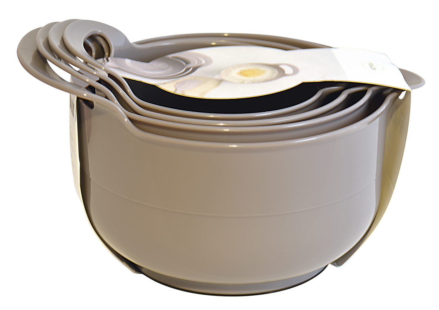 Settet består av 4 stk.bakeboller. I bunnen av skålene er det en gummiring som gjør at de står stødig ved bruk.