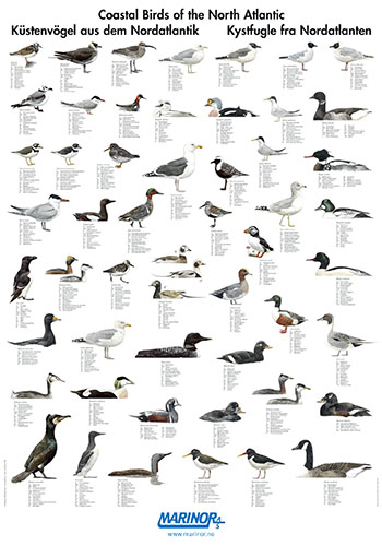 I et par av illustrasjonene er både hannen og hunnen avbildet. Størrelsene på fuglene er også spesifisert, slik at du kan se forskjeller og likheter for de enkelte kystfuglene. Trykket på sterkt glanset papir og laminert slik at den lett kan tørkes av. Mål 70x100cm.