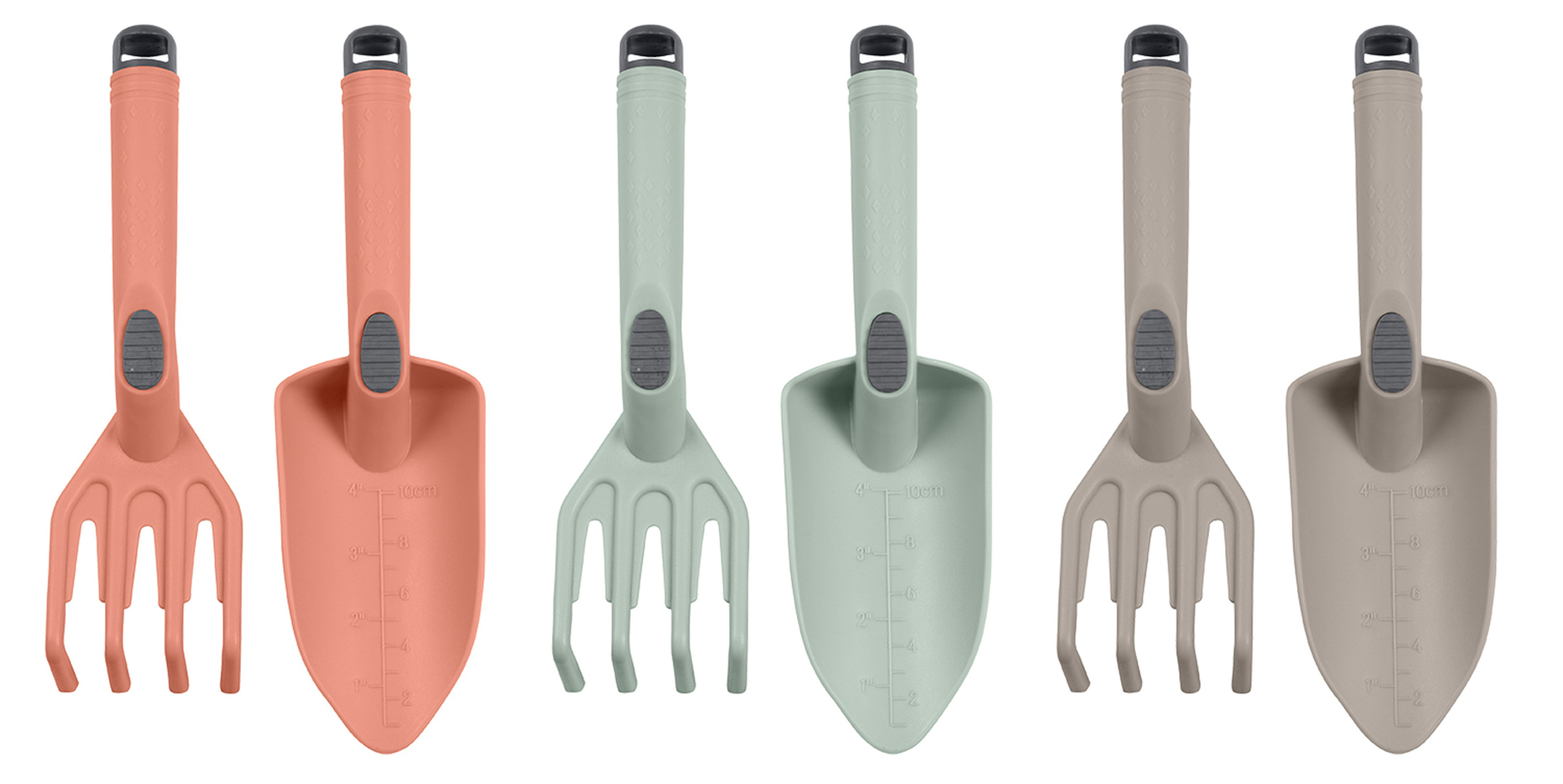 Settet består av 2 deler, spade og lukeklo. Farger: Misty Coral, Mint Green, Flint Grey.