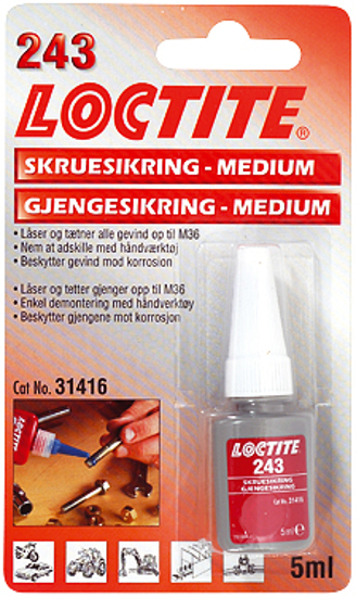 243 Gjengelåsing. Middels høy styrke. Brukes for festing av tetninger og skruer, muttere og pinnebolter slik at de ikke løsner p.g.a. vibrasjoner. Muliggjør demontering med håndverktøy ved service. Produktet fungerer på alle metaller, inklusive passive materialer (f.eks. rustfritt stål, aluminium og belagte flater). Testet motstandskraft mot mindre forurensninger av industrioljer, f.eks. maskinoljer, korrosjonsoljer og skjærevæsker. 5g.