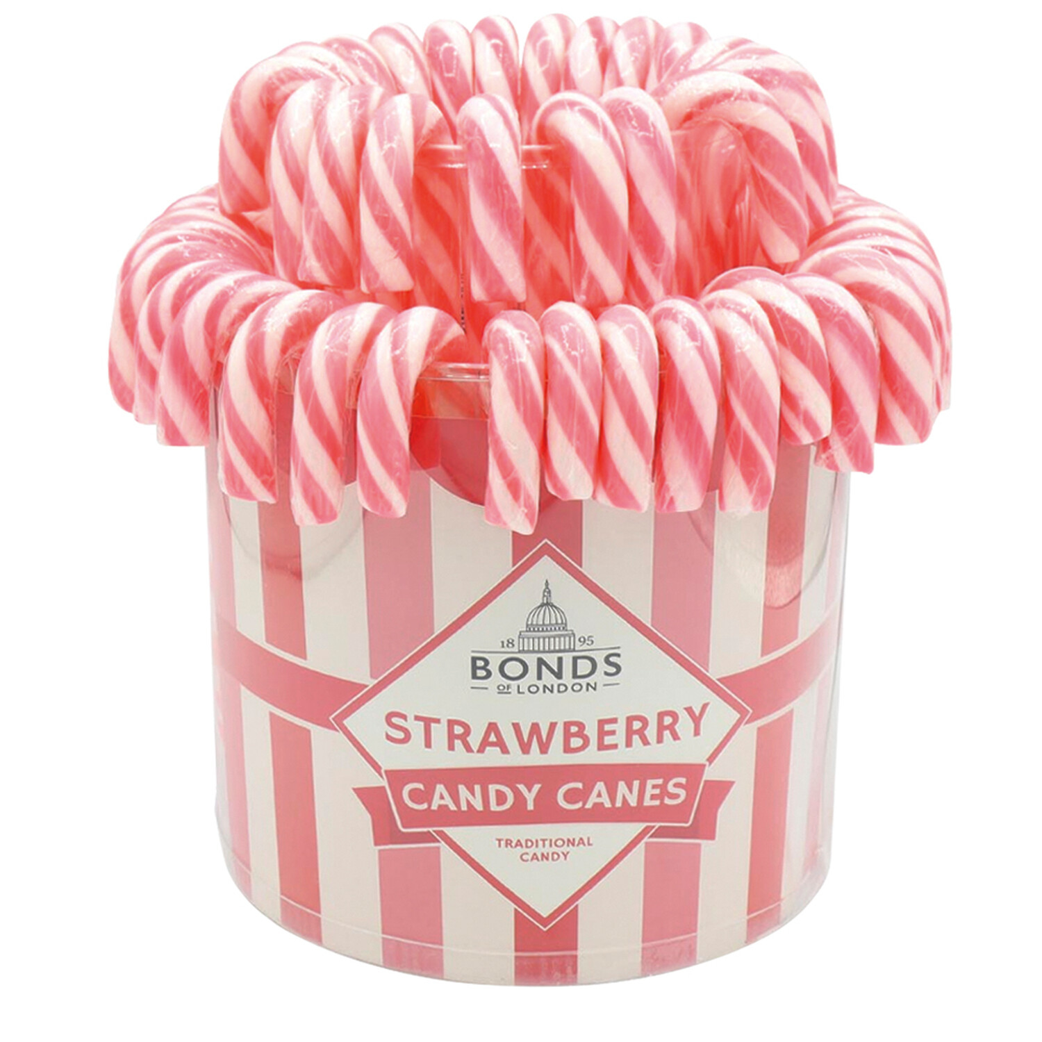 Sukkertøystenger er ikke bare til jul! Bonds of London sin sukkertøystang "fontene" inneholder deilige, hvite og rosa jordbærsmakende sukkertøystenger, presentert i en beholder i fontenestil. Det ideelle midtstykket for ethvert festbord! Her med jordbærsmak.